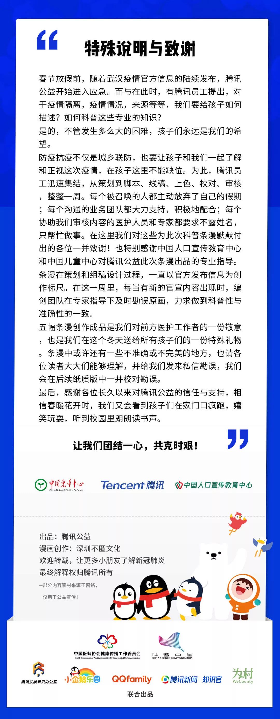 疫情当前,为了让家长和孩子们科学、有效的掌握正确的防疫知识,中国儿童中心携手腾讯公益、中国人口宣传教育中心推出系列科普漫画。漫画是在这个不寻常的假期送给孩子的特殊礼物,将从新型冠状病毒来源说起,科普防疫知识,分享防疫妙招。让我们和孩子一起了解、正视疫情,度过健康幸福的假期!