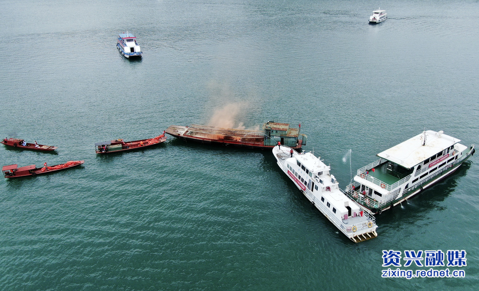 演练模拟场景为,一艘货运船舶在行驶中失控导致偏离航道触礁,船舱壁破损,发生柴油泄漏并起火,船上有1人落水。随后,资兴立即启动二级应急预案,发布航行通告,对事发水域实施交通管制,组织力量迅速开展了落水人员救援、船舶消防、水域污染控制清除、船舶拖离四项演练,同时启动了渡口视频监控系统和AIS、VHF等水上救援通讯指挥系统,第一时间确保人员及船舶安全,遏制油污染蔓延。