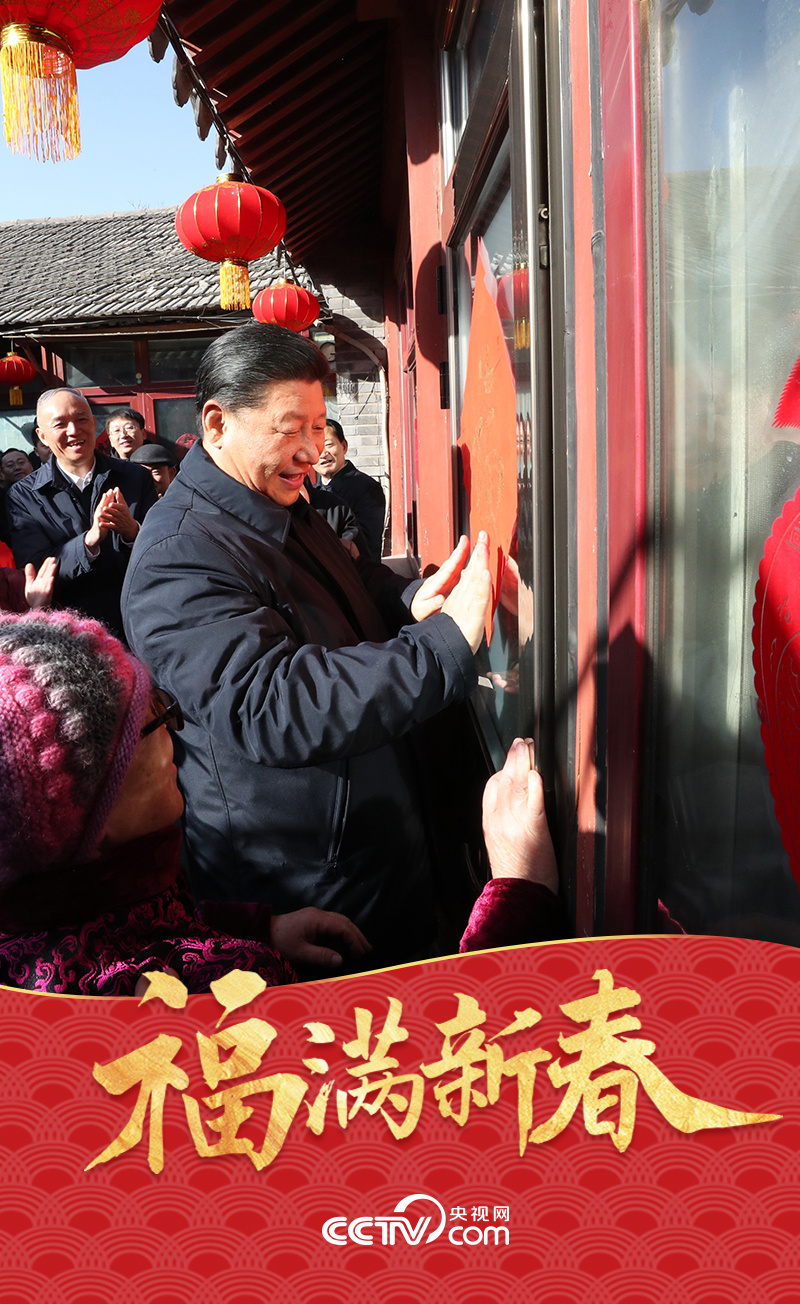 2019年2月1日,在北京前门东区草厂四条胡同32号小院,居民们热情邀请前来拜年的总书记一起贴“福”字。总书记兴致勃勃地拿起一幅红底金色大“福”字,娴熟地贴在大门上。他对居民们说:希望咱们街坊邻居们永远幸福。