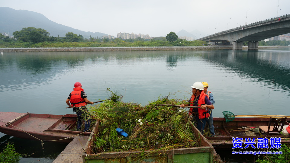 行动中,作业人员携带镰刀、铁锹、长柄捞网等工具,克服江边斜坡陡峭的困难,俯身割除杂草、打捞水面漂浮物,动作娴熟且高效。大家分工协作、相互配合,不放过任何一处影响环境的杂物,忙碌的身影成为了东江湾畔一道别样的风景线。“我们早上八点准点上班,负责东江湾水草清除和漂浮物打捞,每天差不多一吨。”东江湾水域保洁班班长蒋培仁说。