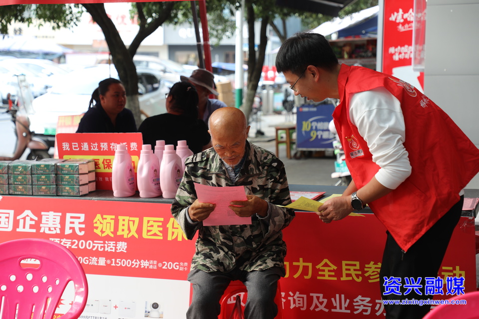 “为深入推进全民参保计划,提高居民参保率,自6月份开始湖南联通携手省医保厅,共同推出‘湖南联通助力全民参保’特惠活动,居民通过预存话费,在拥有更多流量,更好网络的同时,还可以享受1-2人的医保补贴,有效推动医保惠民服务更好地向基层延伸。”中国联通资兴分公司副总经理刘斌介绍。