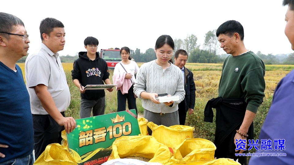测产现场,农技人员严格遵循技术规程操作,选取具有代表性的样本田块,待收割机完成收割、脱粒、清杂作业后,用专业水分测定仪检测稻谷含水量,再结合实际称重数据,精准折算成标准含水量下的亩产量。经现场实测,0.8亩试验田共收获湿谷949.2斤,扣除水分后,干谷亩产达到1036斤,2025年“韶香100”干谷粮价1.6元/斤左右。数据充分证明了该品种的丰产特性和推广价值。