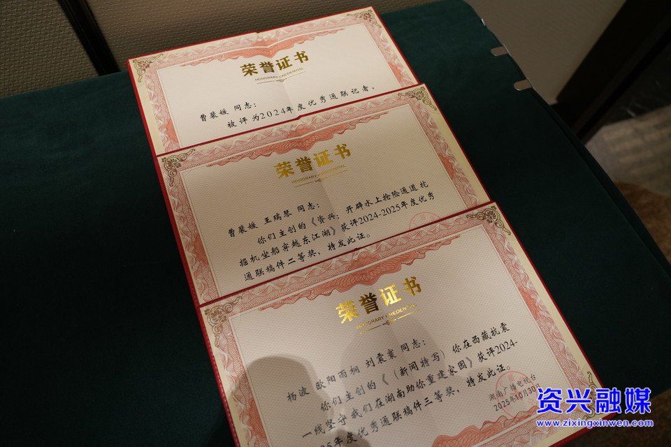 10月30日,湖南广播电视台2025年通联会在永州市祁阳市召开。大会对2024年度湖南广播电视台优秀通联集体、优秀通联个人进行表彰,资兴市融媒体中心荣获 “年度优秀通联集体”荣誉称号,发稿量居全省县市区第一,中心一名同志也荣获 “2025年度优秀通联记者”荣誉,《资兴:开辟水上抢险通道 挖掘机坐船穿越东江湖》《(新闻特写)你在西藏抗震一线坚守 我们在湖南助你重建家园》两件作品分别荣获“优秀通联稿件”二等奖、三等奖。
