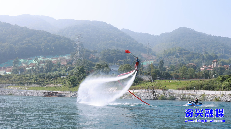 游客中心广场对面水域上,一场“水上飞人”表演破浪而起、如期上演。表演者手持国旗腾空翻转,完成360度旋转、后空翻等高难度动作,将科技感与自然景观巧妙融合,引得观众连连称赞。“技术比较好,然后还有一些翻腾的一些动作,看得比较刺激,双人表演有两个人,看着非常地浪漫,很值得来看。”游客连秀文看完表演后难掩喜悦之情,直言 “这趟来得值”。