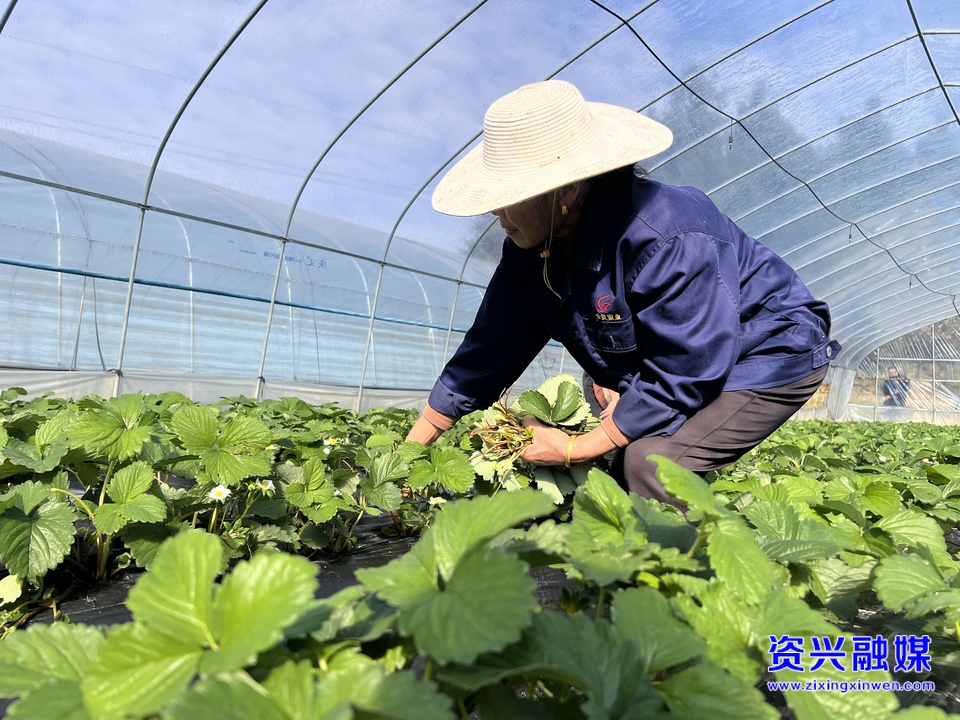 11月20日,在石鼓村草莓种植基地,记者看到,一排排整齐的大棚在阳光下熠熠生辉。大棚内一垄垄绿色的草莓苗生机勃勃,白色的花与白色的果实相互点缀。基地负责人黄定彪来自浙江,从事草莓种植行业多年,有着丰富的种植实践经验,这会正带领农户们在果园内忙着给草莓苗除草、摘除葡萄茎。